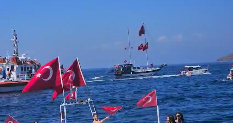 Deniz üzerinde yapılan gösteri, ada sakinleri ve tatilciler tarafından yoğun ilgiyle izlendi. Türk bayraklarıyla süslenen botlar ve teknelerin oluşturduğu görüntü, gökyüzünde dalgalanan ay yıldızla birleşerek izleyenlere unutulmaz anlar yaşattı.